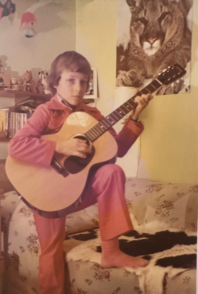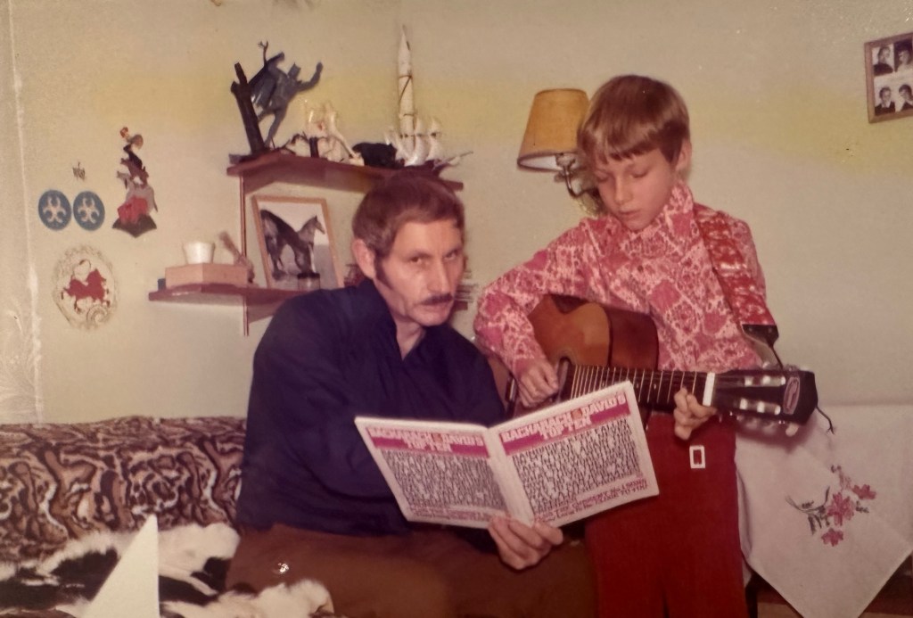 In 1970, folk guitar was all the rage, and music classes at school consisted of everyone learning to play folk guitar: i.e. strumming chords and singing. Oma decided that I should learn an instrument, and was given the choice of guitar, piano, or accordian; naturally, I choose guitar. However, she also decided that strumming guitar was not learning music, and that I had to “learn to play notes”.