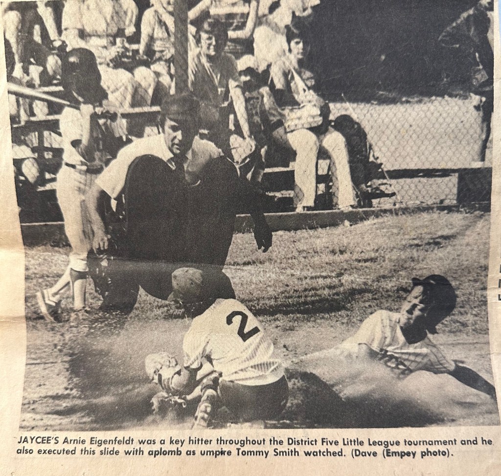 From the North Shore Citizen, July 27 1975: “Eigenfeldt, Jaycee’s most consistent hitter and versatile defensive player, slammed a three-run home run in the first inning to get the North Van crew rolling. Jaycee tied it in the bottom of the fourth on a great heads-up piece of base running by Eigenfeldt. He singled to start the rally, then scored when Vandyk reached first on an error. As the first baseman disputed the call (the umpire said he didn’t have complete possession of the throw from the shortstop), Eigenfeldt kept on running and made it 6-6”.