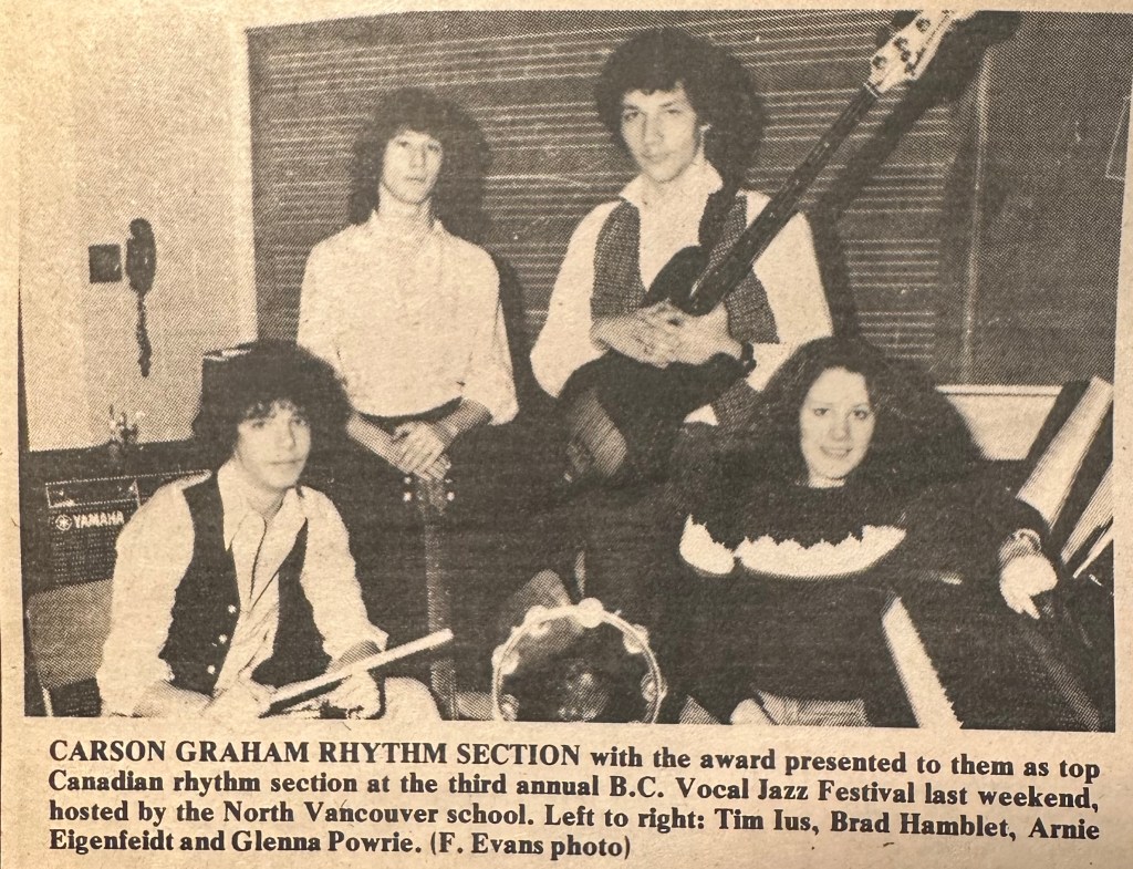 I went to a Junior High School, Hamilton, in grades 8-10, and then a Senior High, Carson Graham, in grades 11 & 12. Hamilton had an excellent music program – in grade eight, the teacher who convinced me to stay in band, led the Hamilton Stage Band (basically a big jazz band) to the Canadian Stage Band Championships, which they won (although I wasn’t in that band); in grade nine, we had a new band teacher, and we also won this competition, in which I played guitar (and was a featured soloist).