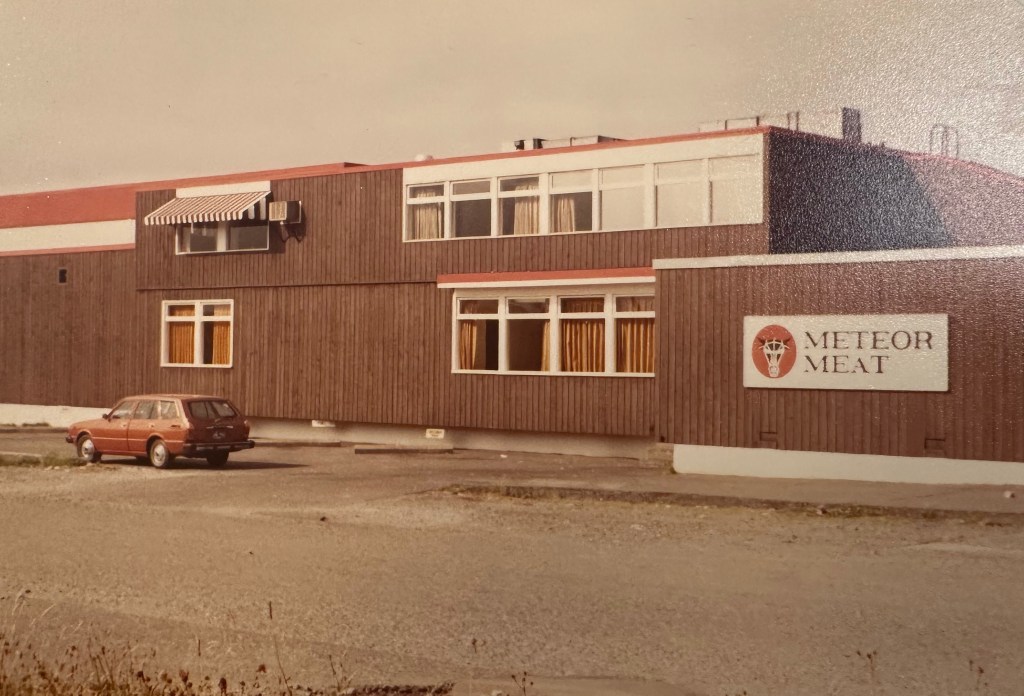 Horst worked extra (overtime) on weekends, going in for a few hours to move the frozen meat between freezers. The photo above was one of those days, as his car is the only car in the lot. I would sometimes come along to “help” move the huge palettes of frozen meat; some of these freezers were -30 degrees.
