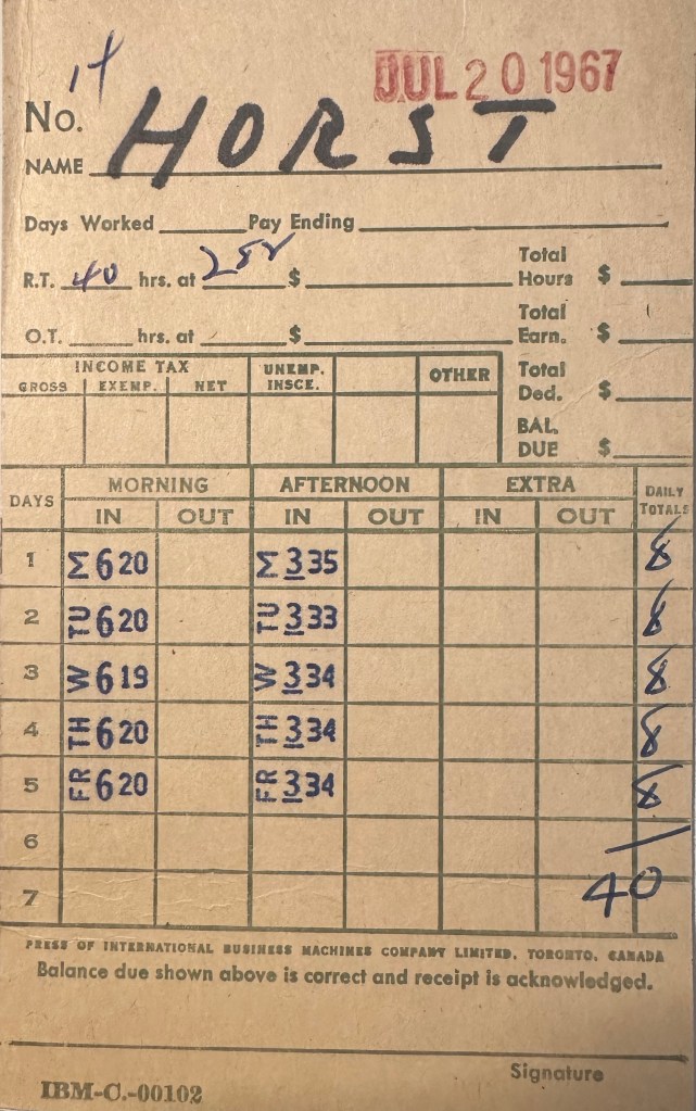 His paycard from July 1967 shows that he clocked in ten minutes early every day, and clocked out 3-5 minutes longer for a full eight hours. It also shows he was making $2.82 per hour.