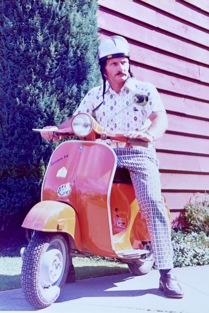 Oma began working in 1975 when I started high school, working as a tailor at a men’s store in Park Royal, Jack Fraser. She needed transportation to get there. Since Opa worked only one mile from home, he purchased a Vespa motor scooter for his short commute.