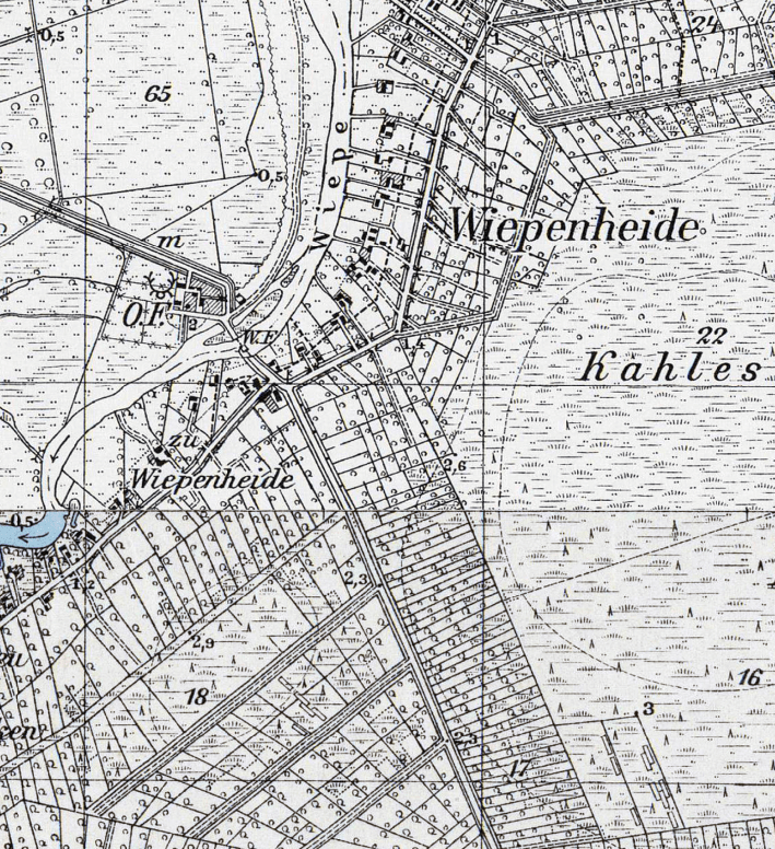 Elly Anni Bendig was born June 19, 1928, in Alt Heidlauken, a village on the Wiepe river. The map below – probably from the 1930s – shows the town name as Wiepenheide; many Prussian towns were renamed in the 1930s to “Germanize” them.