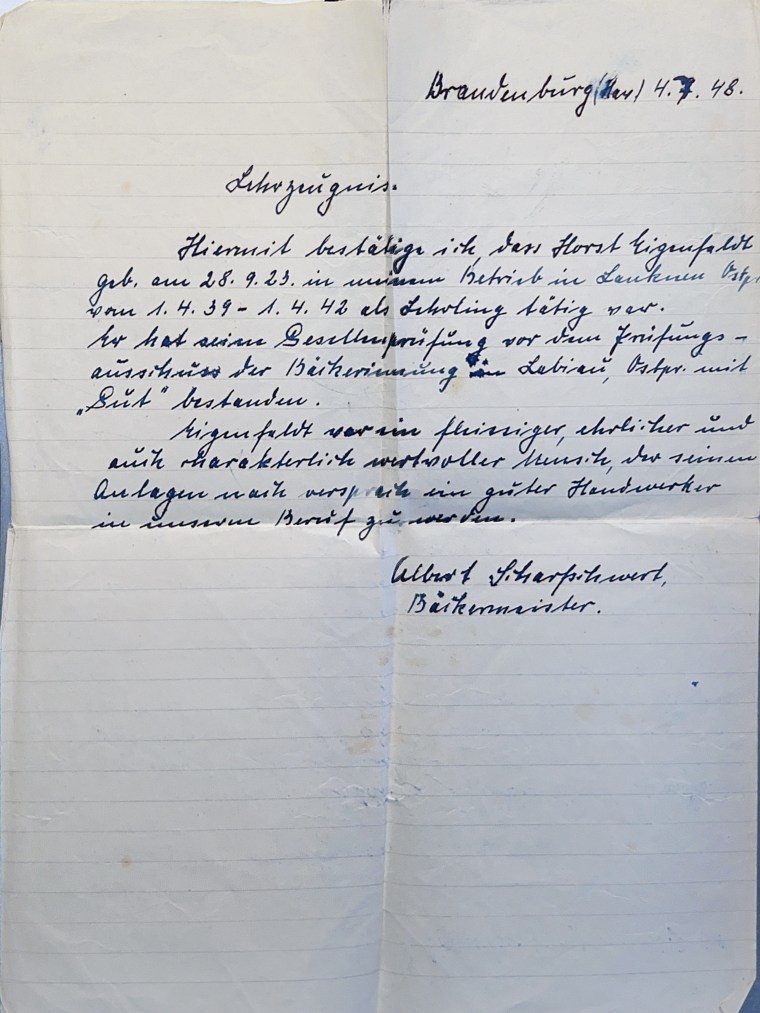 There is a letter of reference dated July 4, 1948, from a master baker in Brandenburg (a part of Berlin).