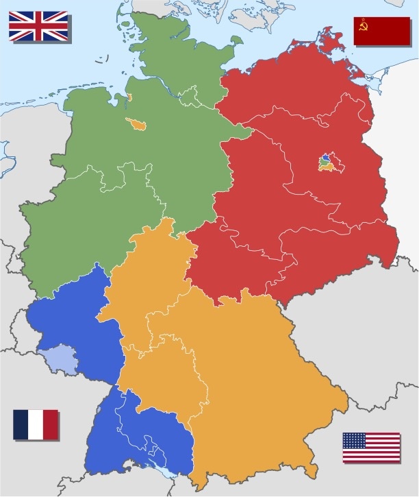 After the war, the Allied countries – the US, the UK, France, and the Soviet Union – divided Germany into four occupied zones.