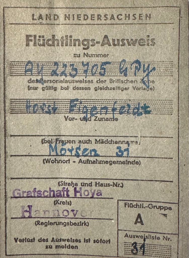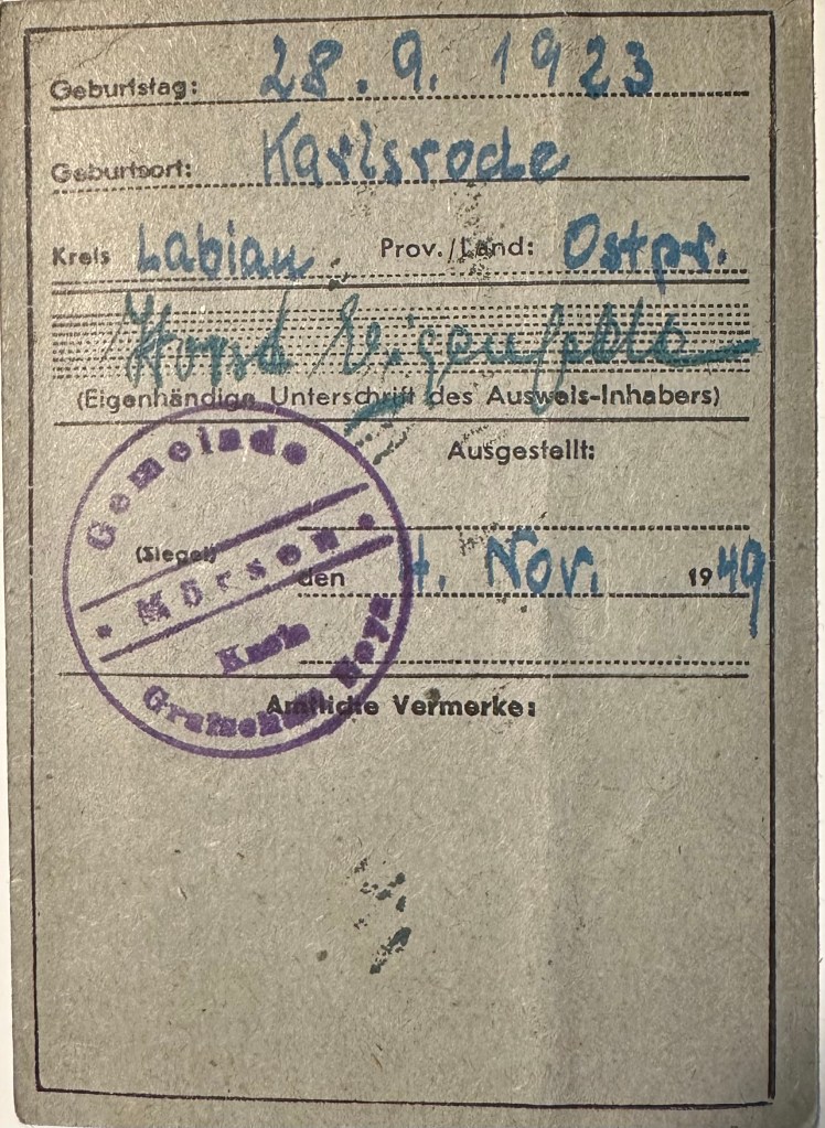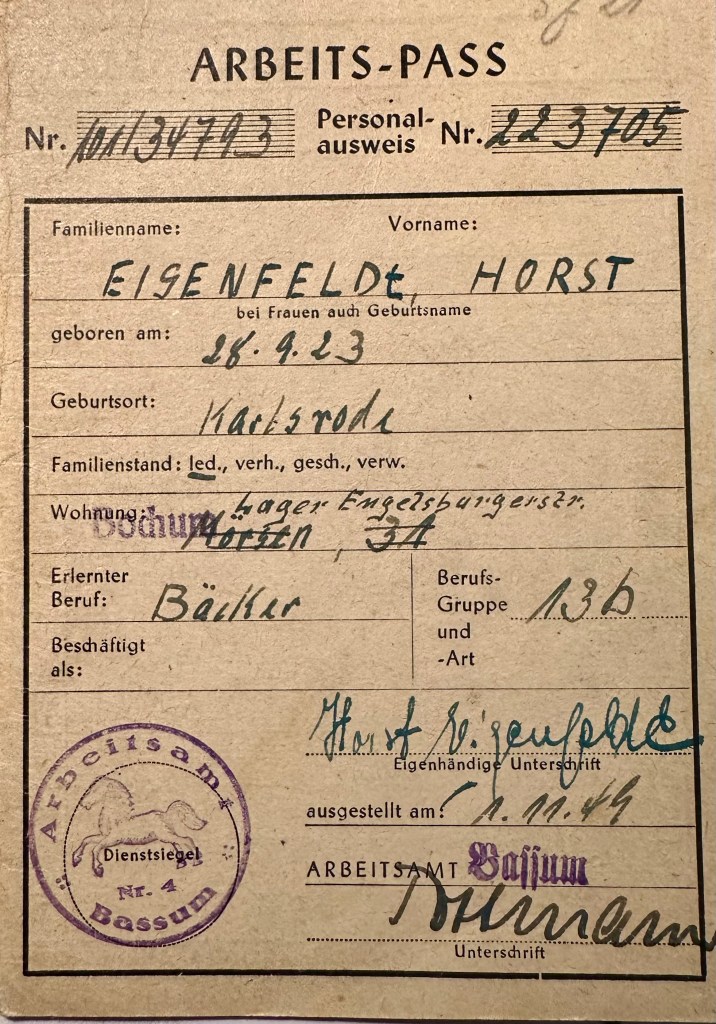 There is a Work Permit that shows his address as a camp (lager) in Engelsburgerstr (which could be the name of a refugee camp), although the issuing agency is Bassum, which is close to his sister Hilde Greve’s farm (where he initially arrived after the war). The date of issue is November 1, 1949.