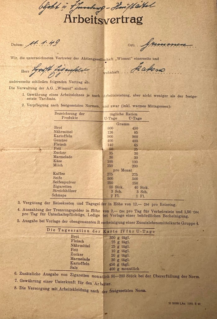 It is unclear why Opa stopped working as a baker at this time, other than he was able to secure another job with better pay and benefits. There is a work contract with the East German uranium mining company, Wismut, dated January 11, 1949.