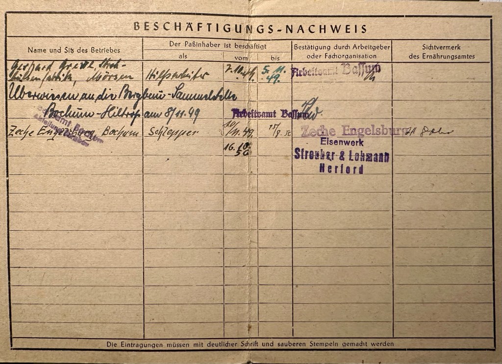 The work permit shows his first day of work was at his brother-in-law’s company (Gerhard Greve) in Mörsen is October 7, through to November 5, 1949. He began another job in coal mining as a tractor operator at Zeche Engelsburg, Bochum from November 11 until August 15, 1950. The last job listed is in ironworks in Herford, beginning October 16, 1950 with no end date.