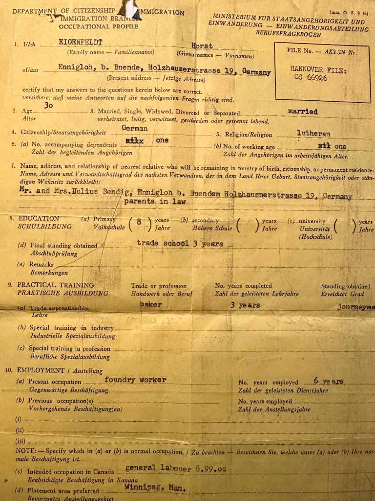Opa’s immigration papers to Canada from 1954 show that he worked as a general labourer in iron works between 1949 and 1954 (although according to the above work pass, he began in the iron works in October 1950).